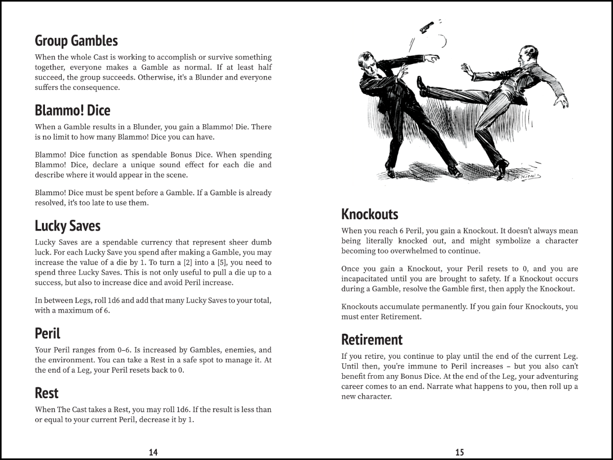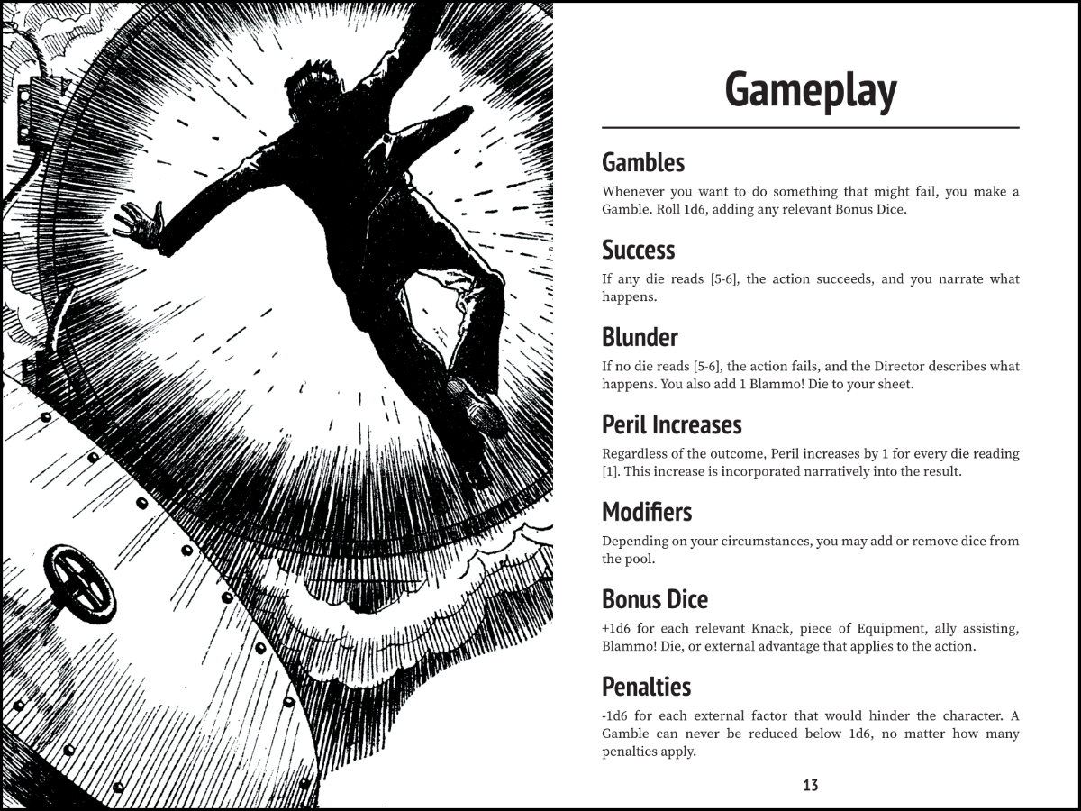 The rules are explosively light. It's built on a d6 dice pool system; you roll a fistful of d6's and let the story take over. Use modifiers like Blammo! Dice and Lucky Saves to keep the action moving your way, just make sure your Peril doesn't get too high.